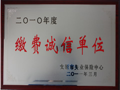 2011年3月22日,我公司榮獲太原市失業(yè)保險(xiǎn)中心頒發(fā)的《2010年度繳費(fèi)誠信單位》榮譽(yù)稱號。我公司在2010年度太原市失業(yè)保險(xiǎn)繳費(fèi)誠信單位表彰活動中,認(rèn)真履行繳費(fèi)義務(wù),依法維護(hù)勞動者合法權(quán)益,受到太原市失業(yè)保險(xiǎn)中心的認(rèn)可。