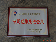2012年2月8日,在山西省道路運輸工作會議上,我公司獲得由山西省交通運輸管理局頒發(fā)的2011年度全省道路運輸行業(yè)《節(jié)能減排先進企業(yè)》榮譽稱號。