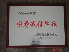 2012年6月20日,2012年6月20日,我公司獲得由太原市失業(yè)保險(xiǎn)中心頒發(fā)的 "二0一一年度繳費(fèi)誠信單位"榮譽(yù)稱號(hào)。
